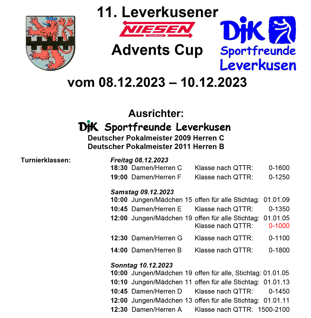 Leverkusen, 12. Dezember 2023 - Nach einer langen Pause fand vom 8. Dezember bis zum 10. Dezember 2023 in Leverkusen der lang ersehnte 11. Leverkusener Niesen Adventscup statt. Die dreitägige Veranstaltung lockte zahlreiche Sportbegeisterte in unsere Halle und sorgte für spannende Wettkämpfe in insgesamt 12 Spielklassen.
